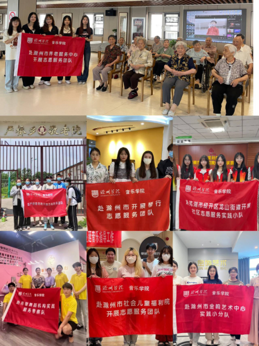 为进一步弘扬志愿服务精神,志愿服务团队分别走进丰盛爱心之家养老院、芜湖市龙山街道大圣社区、严桥乡敬老院等地,用自己的陪伴和关爱,帮扶慰问孤寡老人,以实际行动弘扬了雷锋精神,展现出新时代青年志愿者风采。部分志愿团队来到滁州金鸣艺术中心,全面了解了艺术中心里学生们的情况,帮助他们改正不正确的弹琴习惯和技巧,并手把手指导学生练习,教授乐理知识,帮助他们接触不同的乐器等。