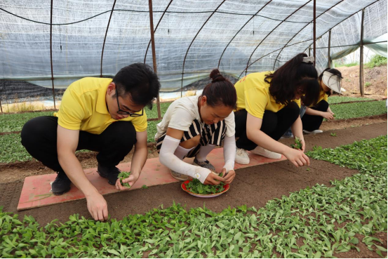 实践团队在管店镇镇政府相关负责人的带领下来到了农户家的甜叶菊种植田地。团队成员边帮助农户插苗边与农户进行交流,在交流中我们得知,管店镇种植甜叶菊并不是农户的单打独斗,而是采用“公司+合作社+基地+农户”的运作模式,在生产经营的各个环节由合作社统筹安排,合作社与育苗户签订保护价,为育苗户提供优质种苗、育苗场地,投资基础设施建设改善生产条件等,合作社尽最大努力保障农民增收盈利。