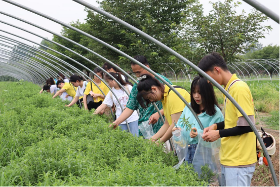 随后,在研究生们的带领下,团队驱车前往明光市桥头镇优质甜叶菊种苗繁育基地。在帮助研究生们采摘甜叶菊的过程中,黄赵强同学对实践团队的成员们说“苦,是对环境、形势和局面的一种描述,也是对个人意志品质的一种检验。现在的我们头顶烈日,汗流浃背,采摘甜叶菊用于实验的过程看似辛苦。但当我们在实验过程中取得进展时,当我们将论文转化为实践成果时,当我们可以用自身所学帮助到农民和国家时,那是我们最快乐的事情。我们看似在‘自找苦吃’其实是甜在心间。”