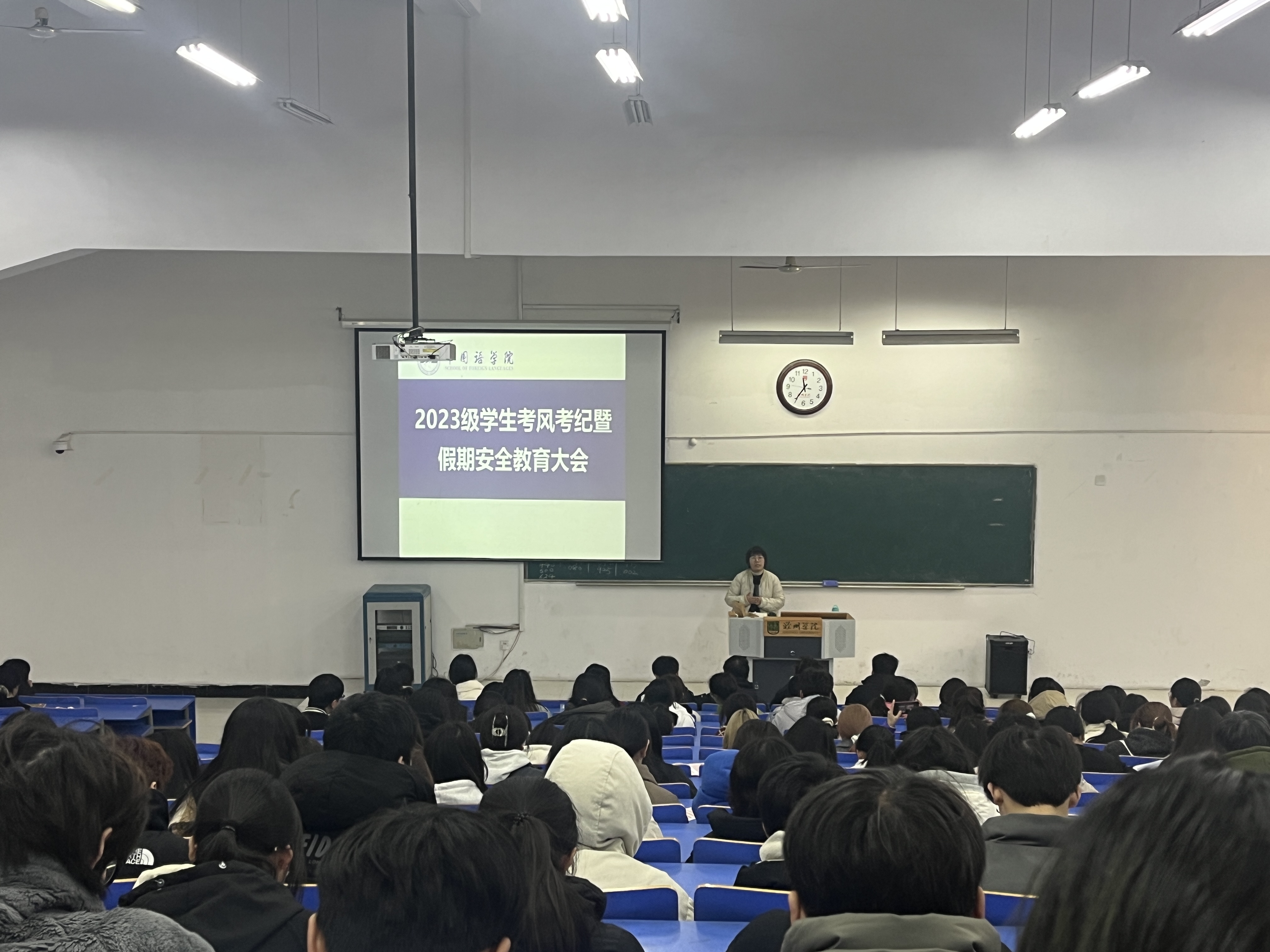 1月12日上午,外语学院召开2023级学生考风考纪暨假期安全教育大会。院党委副书记何丹丹在前期各班已经召开相关班会的基础上,着重就期末考风考纪、防范电信诈骗、离校交通安全和假期学习规划等工作再次进行了强调和布置。